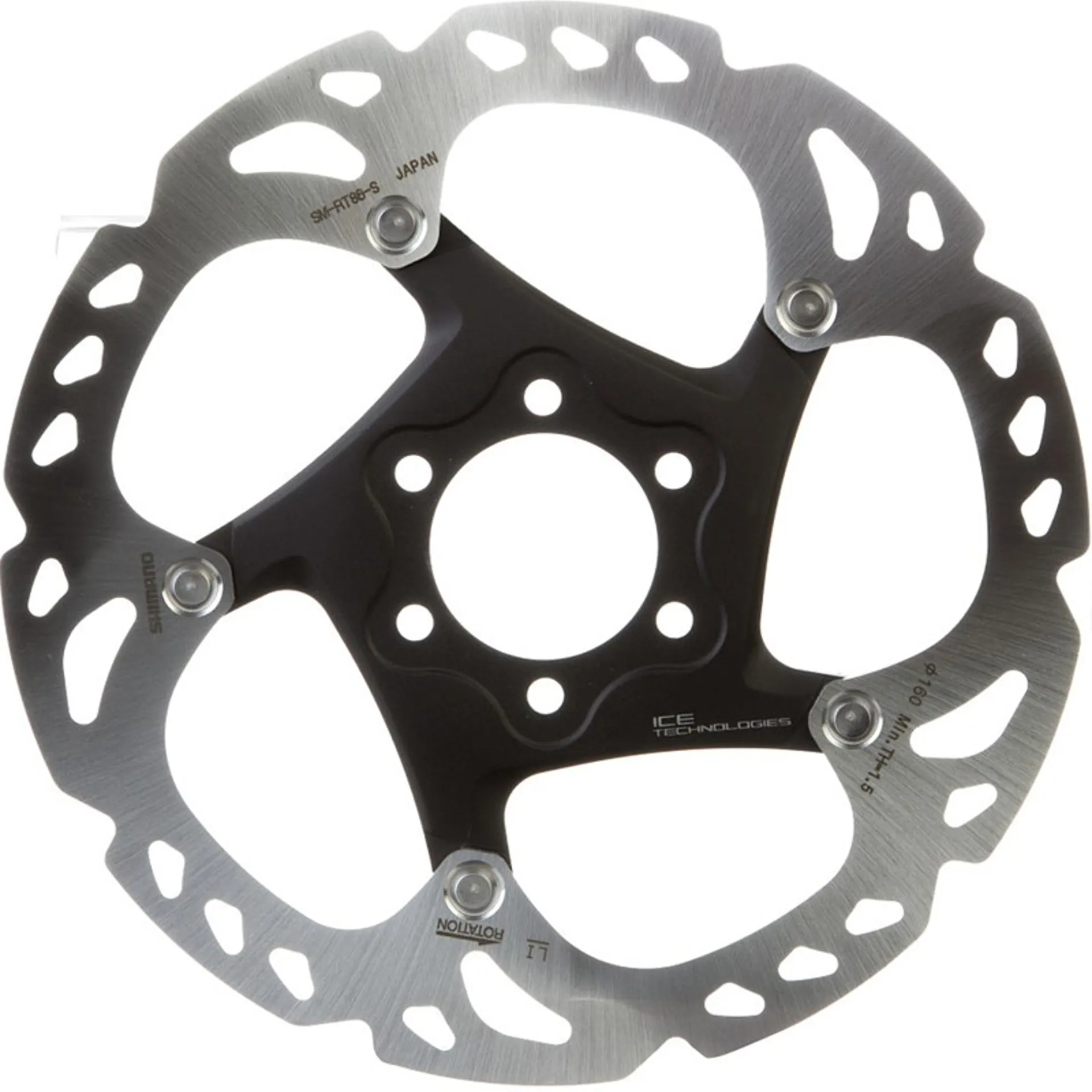 Shimano Sm-rt86 Xt Ice-Tec 6 Bolt Disc Rotor SM-RT86 Ice-Tec rotors give excellent performance made from a stainless steel / alloy 3-layer sandwich construction that manages heat while riding The clad steel / alloy / steel rotor construction allows heat generated from braking to radiate quickly through the aluminium core achieving surface temperature drops of around 50 deg C. When used with Ice-Tec pads surface temperatures can drop from around 400 to 300 deg C, this provides great improvements in performance all round Ice-Tec rotors achieve long pad life, less noise and less fade due to improved heat dispersion 6-bolt mounting system Rotor contact surface has been developed for excellent pad clearing and cooling which increases pad performance and life Large forged alloy spider supports rotor surface, increasing rigidity and reducing weight